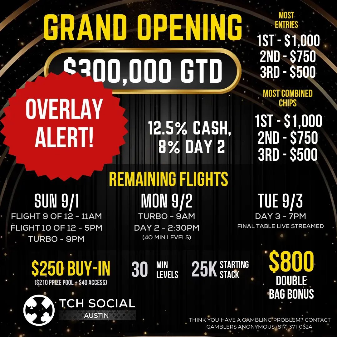 TCH Social Austin is raising the stakes with a monumental $300,000 guaranteed prize pool tournament to celebrate its grand opening, with only a $250 buy-in! This five-day poker festival features multiple flight options, a generous $800 double bag bonus, and enticing bonuses for most entries and combined chips, promising an unforgettable launch for Austin's newest premier poker destination.