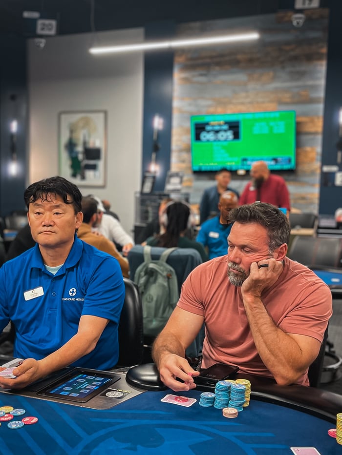 Brent Morehouse defended his big blind and the flop came paired with T♦5♠5♣. Morehouse led out for all of it. His jam was roughly 68,000 effective. Webster flicked in a one-chip call.