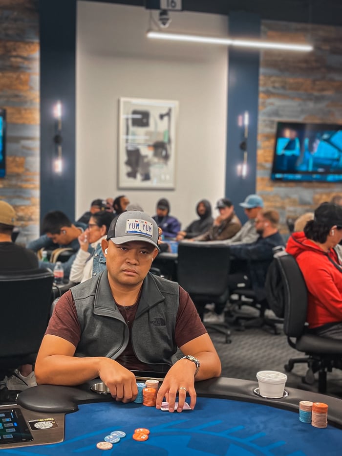 Niyati tabled T♣8♣ for eights full of tens. Vo rolled over red aces and Sambangi turned over red nines for a flopped full house. The 6♥ completed the board; Vo was eliminated and Sambangi more than tripled up.