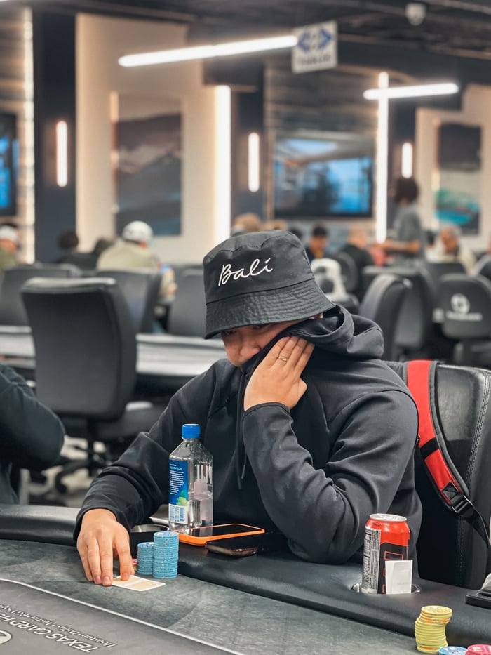 The flop came A♦7♦4♦ and Tran donk-jammed as the covering stack. Thomas went into the tank.